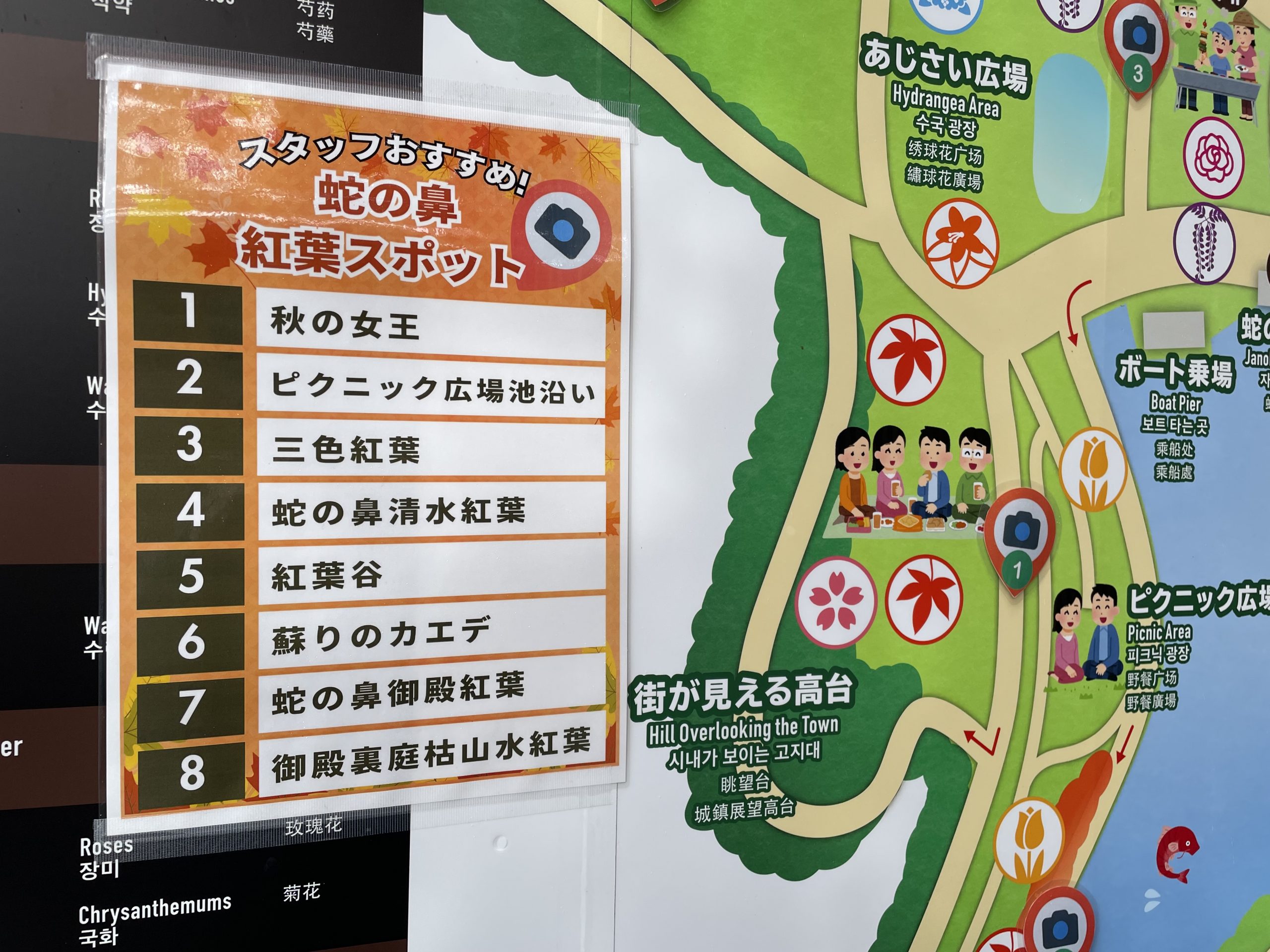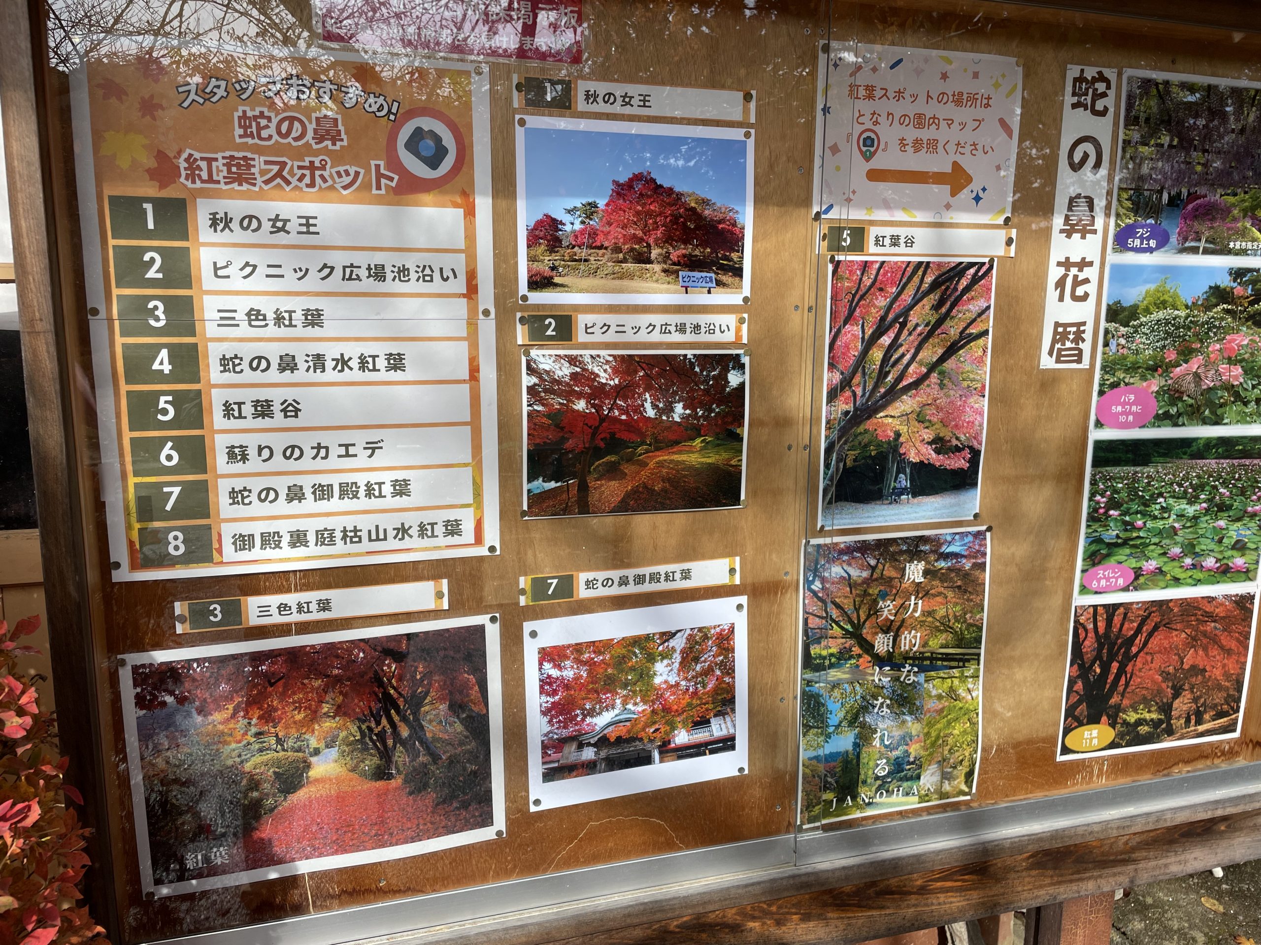 園事務所横の掲示板と園内案内看板には園内の紅葉のビュースポットがわかりやすく表示してあります。紅葉狩りにご来園の際はご覧ください。