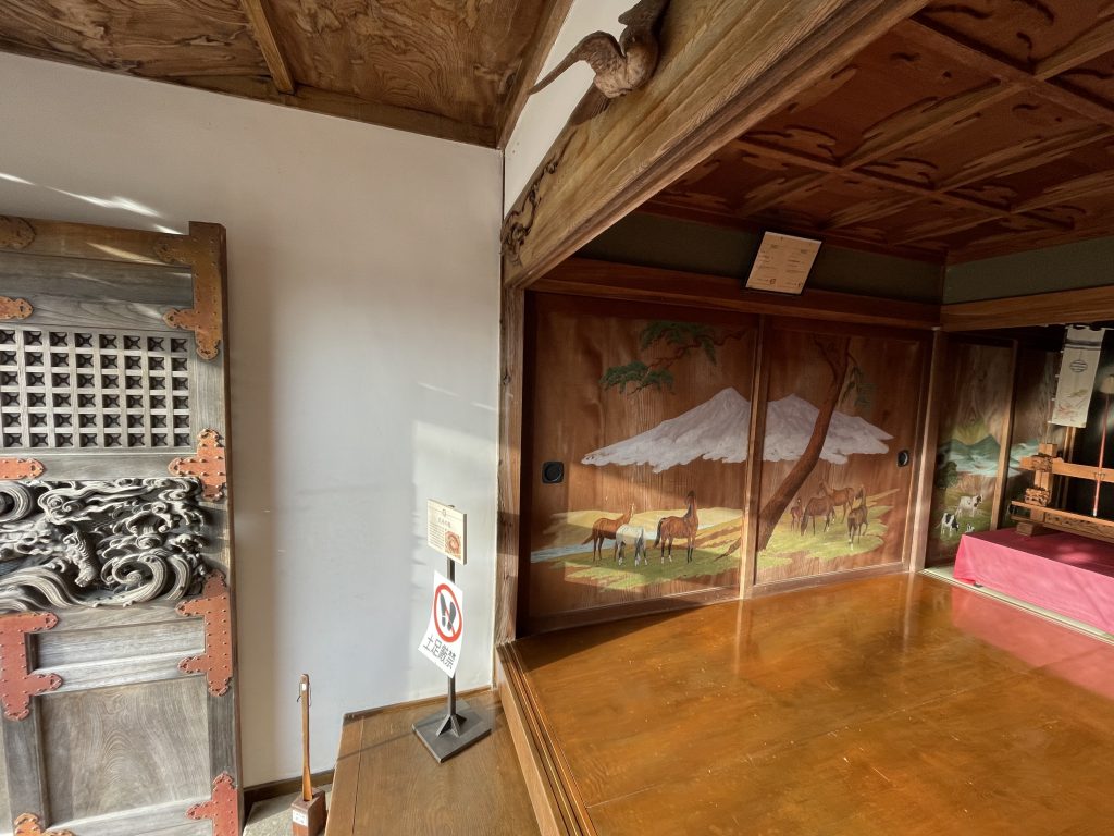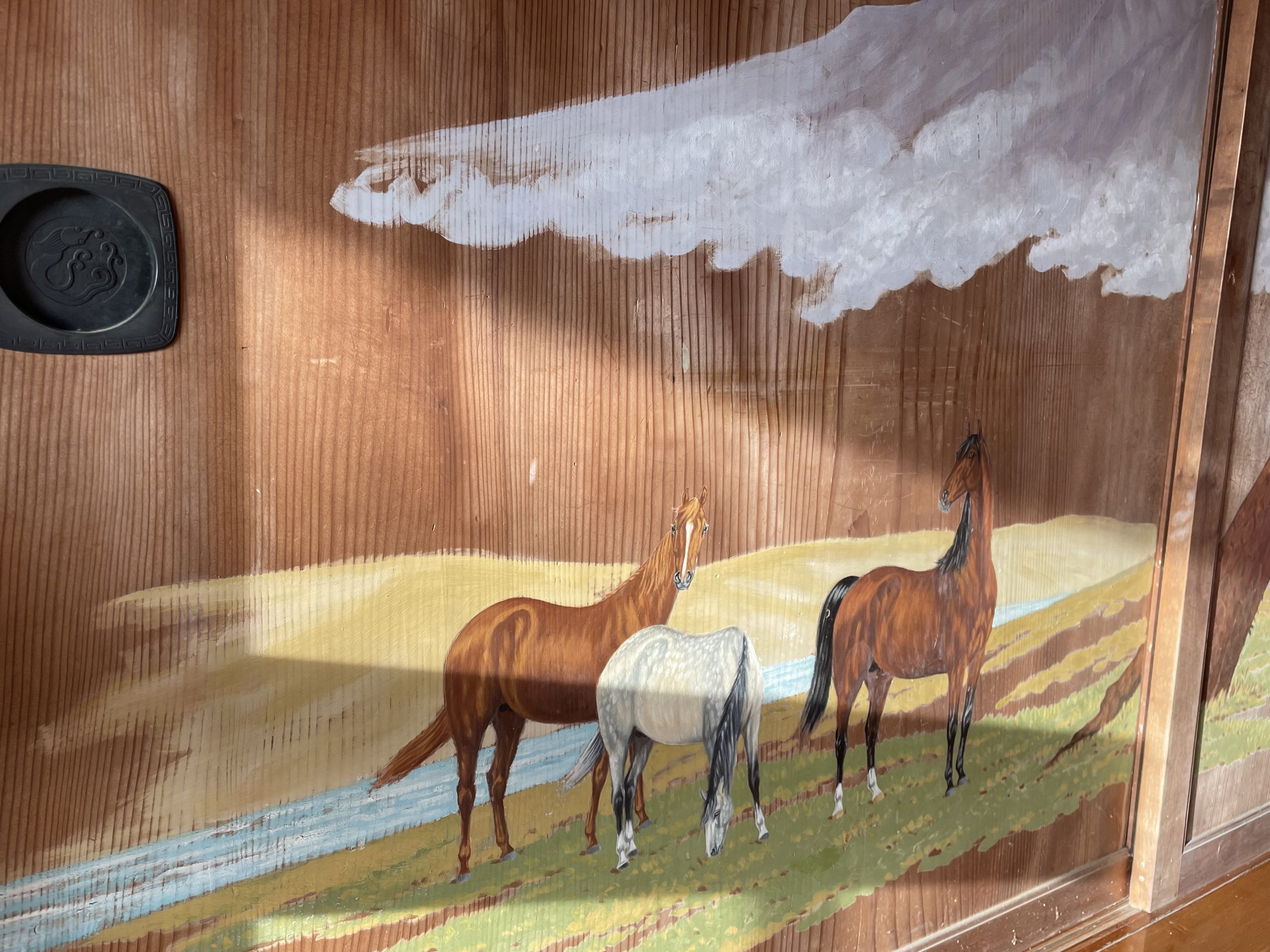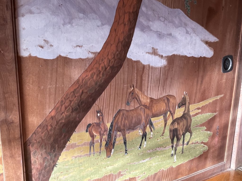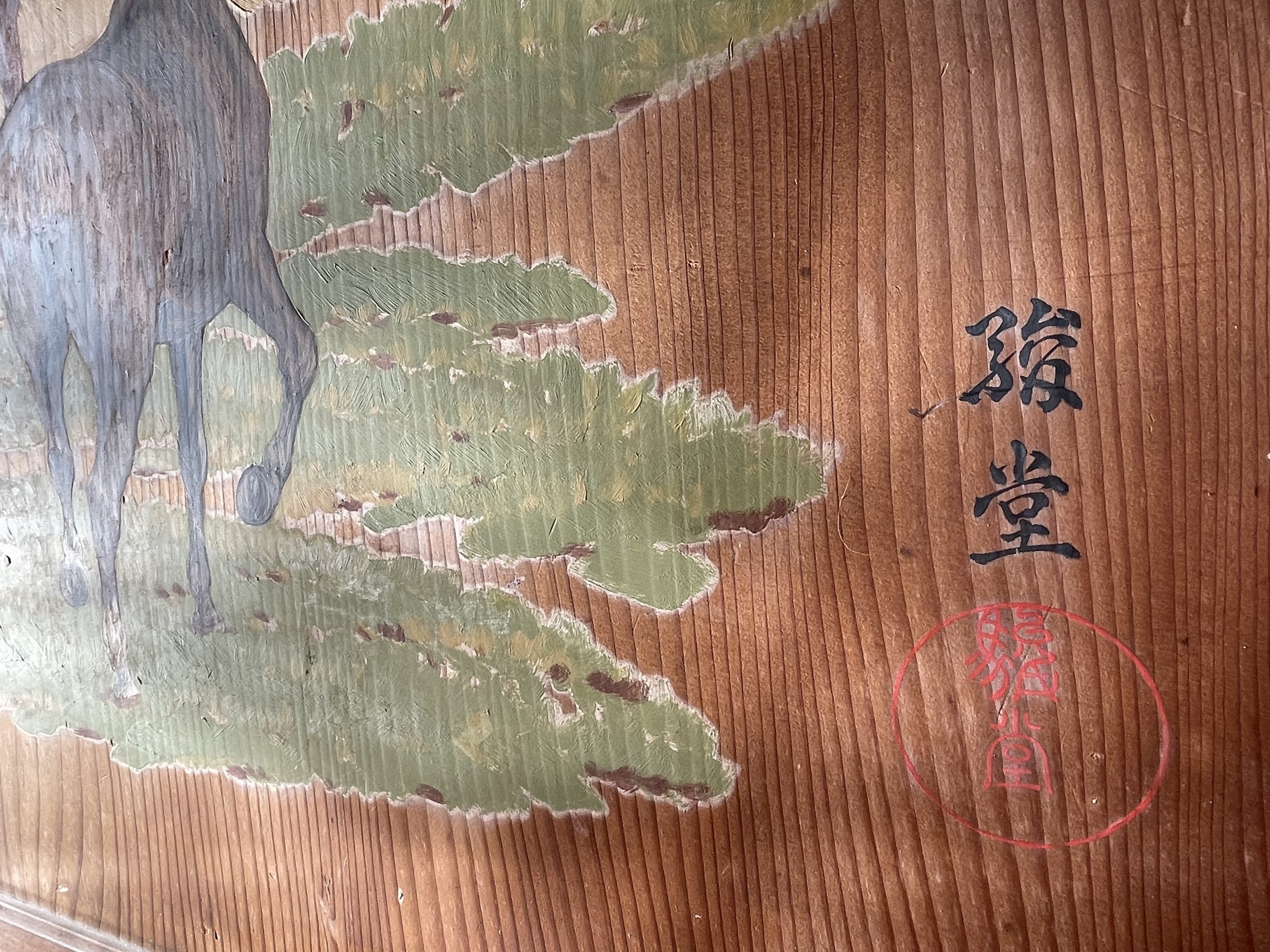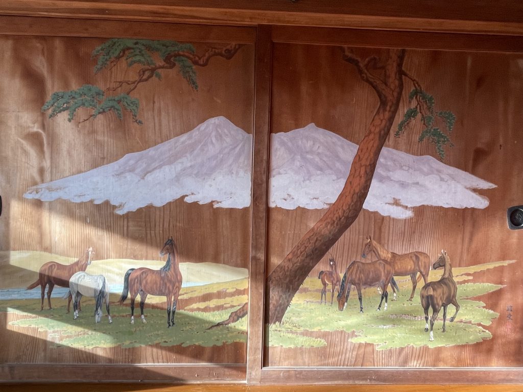 国登録有形文化財『蛇の鼻御殿』の玄関を入るとすぐ左側に、秋田杉の一枚板に描かれた馬の作品があります。馬を主題にした作品を多く描いた海老根駿堂(明治38年-平成元年)の作品『蒼龍山荘百香院南窻(窓)下記念日馬遊図』です。背景にはけぶる様に描かれた安達太良連山、その手前に草をはむ馬たちの姿が描かれています。海老根駿堂は日本美術界では広く名の知れた画家ではありませんが、馬というモチーフに特化して描き続けた画家として知られ、神社への奉納作品や、公共的な場の大規模な作品を制作した画家でもありました。また、この建物の主、伊藤弥(わたる)は、福島競馬場の建設に貢献した人物の一人でもあります。今年は午年です。訪れた際には是非ともご覧になっていただきたい作品の一つです。