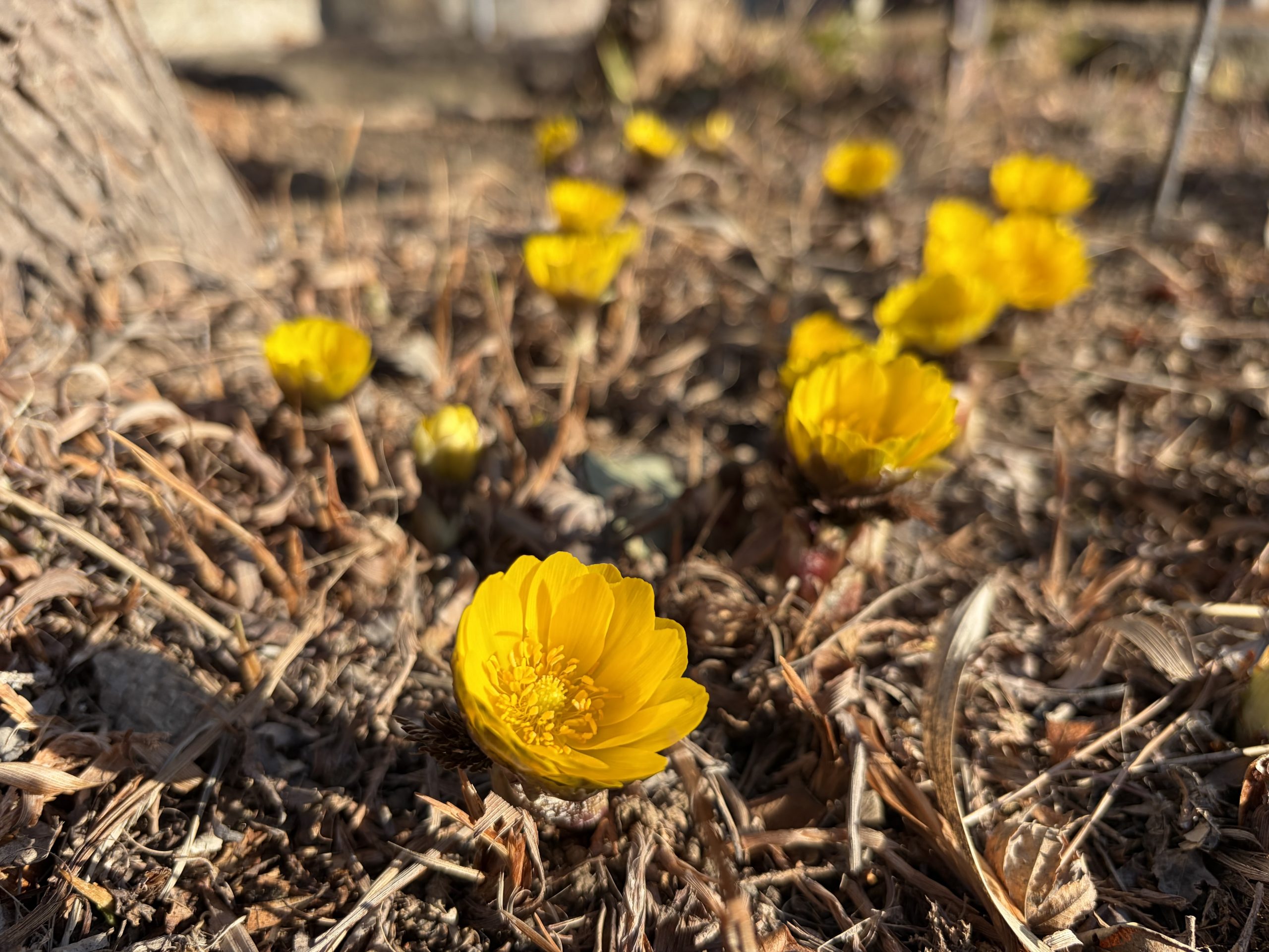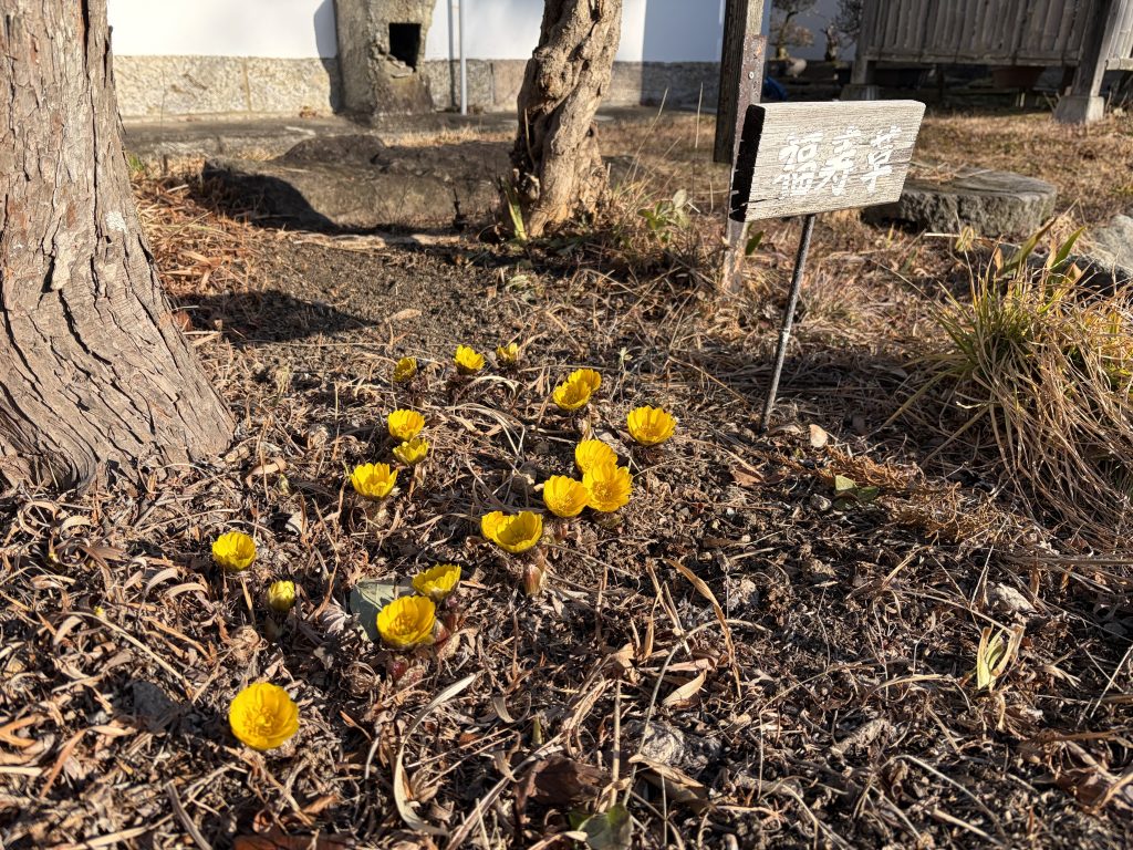 厳しい寒さも和らいだ二日間。明日からまた厳しい寒さになりそうで文化財エリアの福寿草が咲きそろいました。