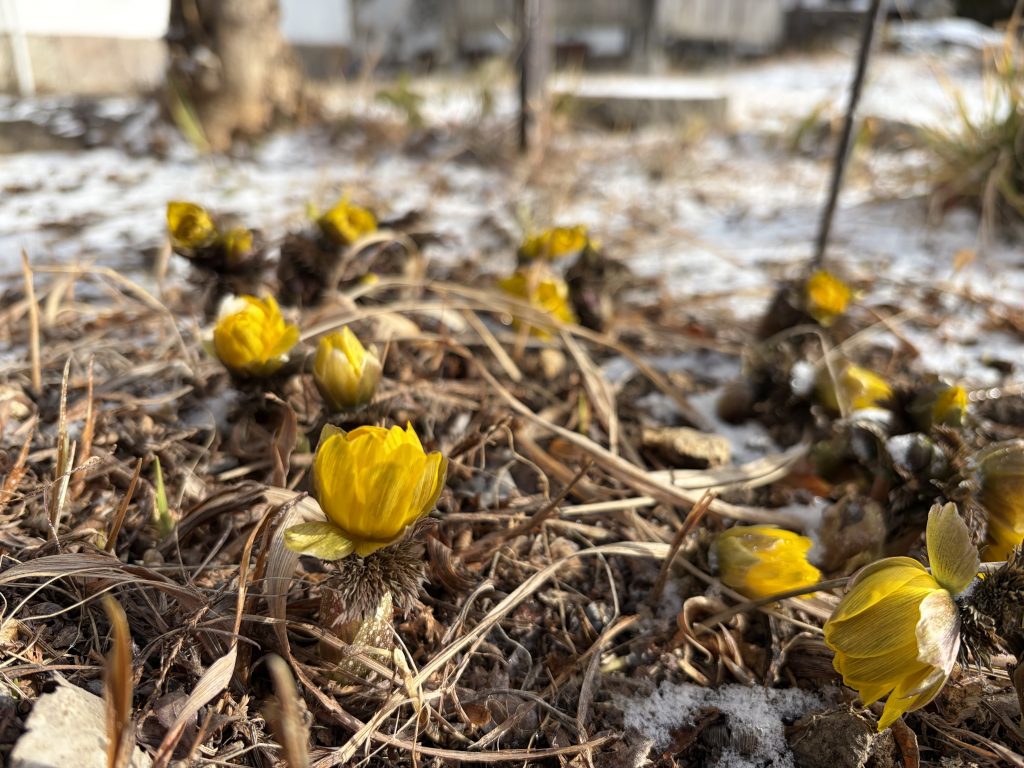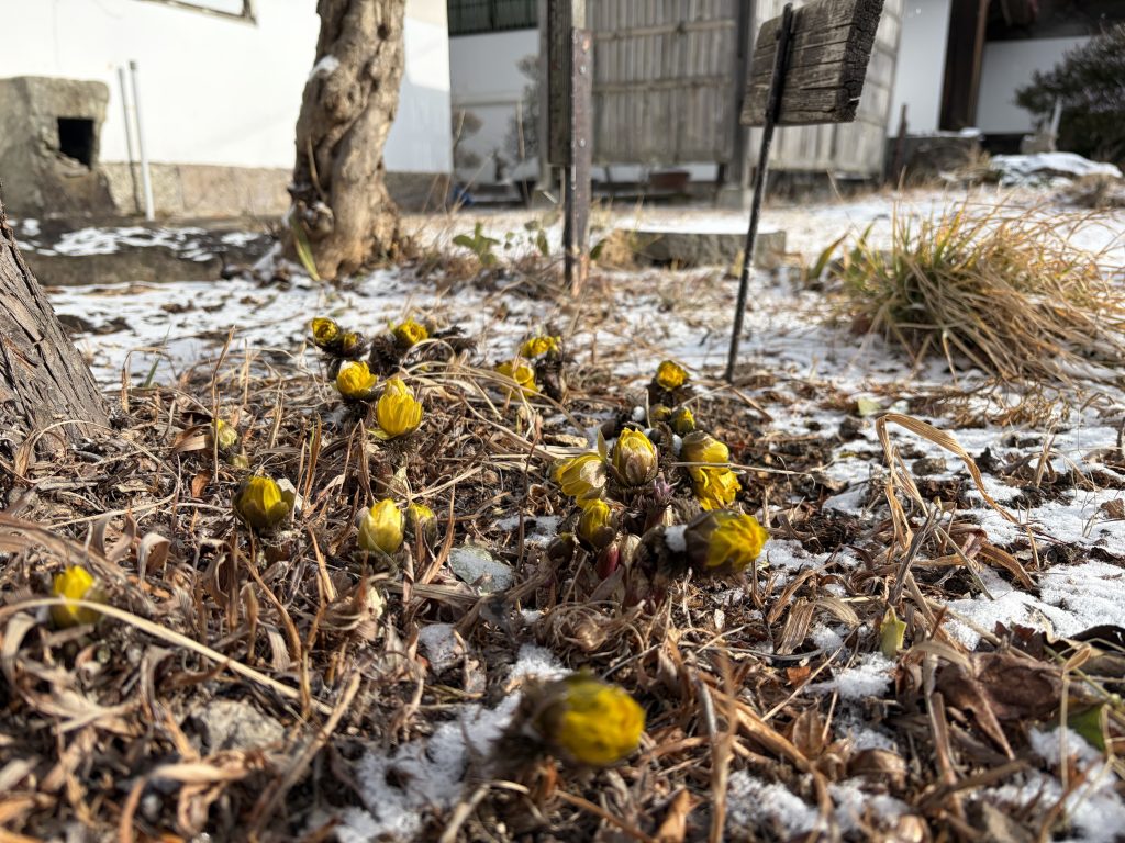 夜遅くに降った雪で地面は薄っすらと雪化粧。福寿草の花も今日は閉じています。