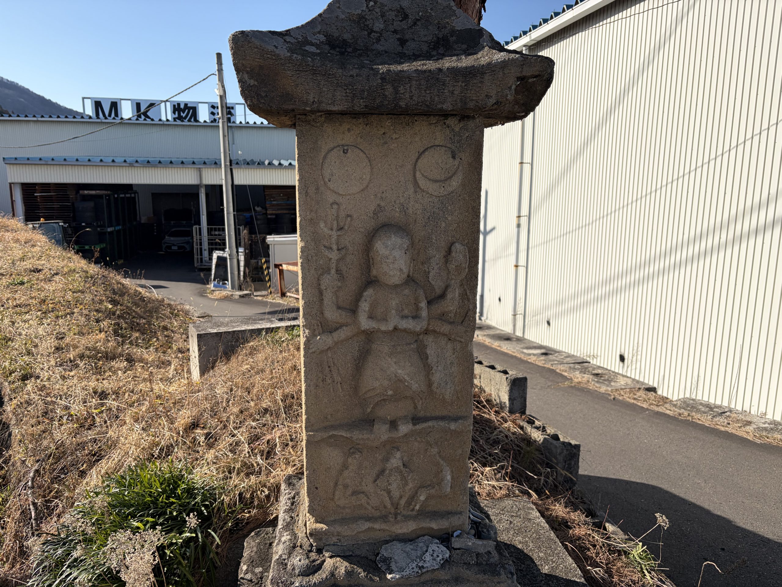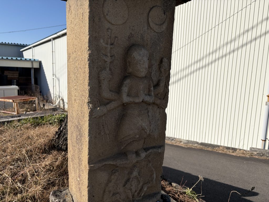 昨年の暮れにお客様より問い合わせの電話がありました。「蛇の鼻さんの北側の道路沿いにある小さな塔のある塚は何ですか?」という内容でした。確認したところ現在は園外ですが、その昔、今のツバキ・山茶花通りが馬車道だった頃のころの入口があった付近でした。伊藤家が祀ったものかと調査に出かけましたが、脇に彫られた年号が享保3年と読み取れるので、1718年今から308年前に建立されたものだということが確認できました。その時代は八代将軍、徳川吉宗の治世初期です。この塔には青面金剛像が彫られており庚申供養塔であることがわかります。青面金剛は道教由来の守護尊で、人の体内にいる「三尸(さんし)の虫」が、庚申の日に天帝へ悪事を告げに行くのを防ぐため祀られたもののようです。