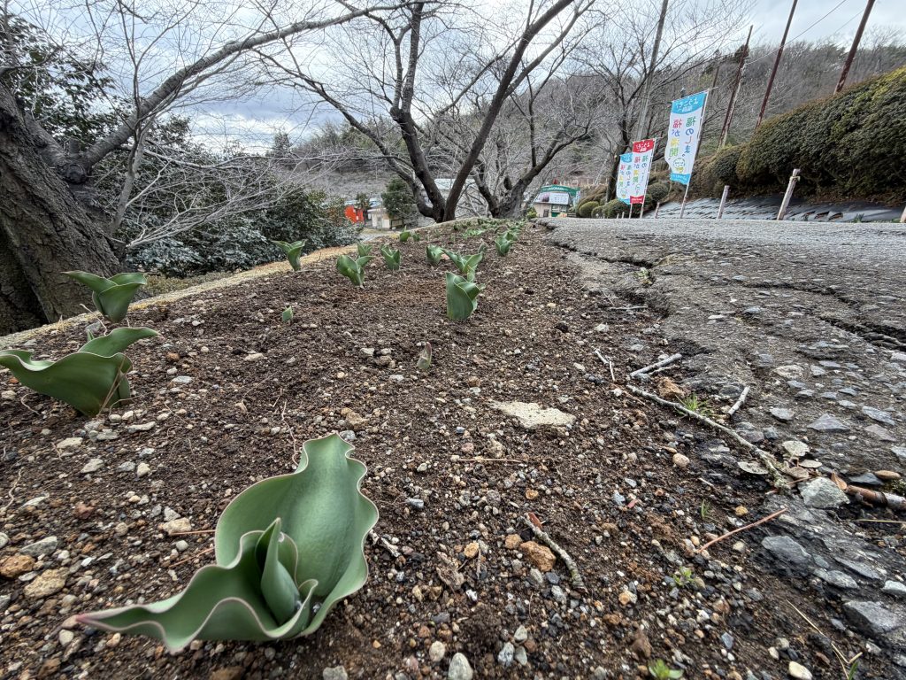 夜明け前に雪が吹雪いていましたが、夜が明けるとともに気温も少し上昇してきた模様で幾分か寒さも和らいだ今日となりました。チューリップの芽も陽当たりの良い場所ではどんどん成長してきています。
